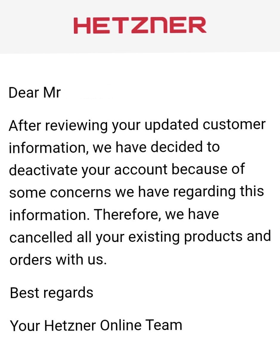 The Hetzner story doesn’t end there. When Monday finally arrived, my account was deactivated because ”Mr. H” had some ”concerns” with the information I provided. I’m still not entirely sure what that meant.